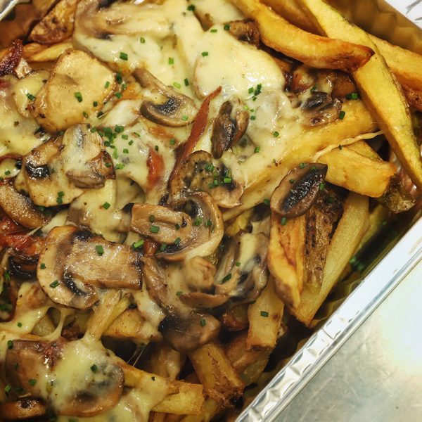 Papas Fritas, Queso Derretido con Champiñón de medio metro y porción de Crema Sour